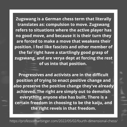 Zugswang is a German chess term that literally translates as: compulsion to move. Zugswang refers to situations where the active player has no good move, and because it is their turn they are forced to make a move that weakens their position. I feel like fascists and other member of the far right have a startlingly good grasp of zugswang, and are verya dept at forcing the rest of us into that position.