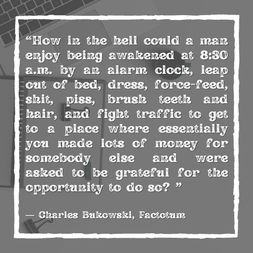 “How in the hell could a man enjoy being awakened at 8:30 a.m. by an alarm clock, leap out of bed, dress, force-feed, shit, piss, brush teeth and hair, and fight traffic to get to a place where essentially you made lots of money for somebody else and were asked to be grateful for the opportunity to do so? ”