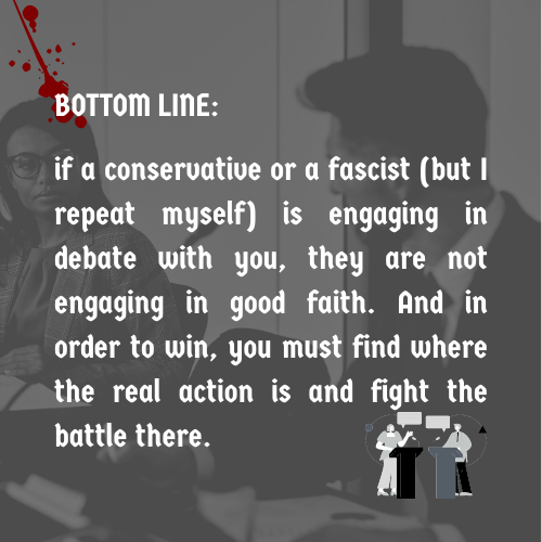 Bottom line: if a conservative or a fascist (but I repeat myself) is engaging in debate with you, they are not engaging in good faith. And in order to win, you must find where the real action is and fight the battle there.