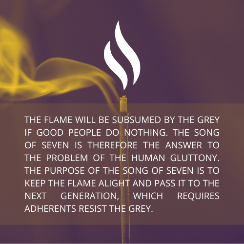 What is ours? The Flame will be subsumed by the Grey if good people do nothing. The Song of Seven is therefore the answer to the problem of the human Gluttony. The purpose of the Song of Seven is to keep the Flame alight and pass it to the next generation, which requires adherents resist the Grey. Fascism will devour everything and then itself. The Empire will conquer everything and then itself. Capitalism will sell everything including its own life. The Grey is a cannibal suicide cult. And we stand in defiance against the Grey.