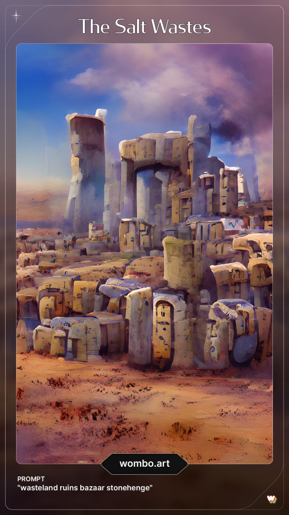 The Foglands is an eerie place for new arrivals to experience. The concrete hard sand dunes and broken rocky ground have been desaturated by some earlier tragedy and most of the landscape is the weird monochrome of a 1950s television broadcast. The sky, by contrast is a toxic looking bloody orange by day, and a deeper near opaque orange black at night- marked by a hallowe’en orange moon. The brackish lakes and inland seas are nearly all a rusty orange from the oxidizing metal and salt content of the water. Grey and Orange. Monochrome and and garish contrast. The visuals along are enough to make some new arrivals lose what lunch they brought with them for the incursion.